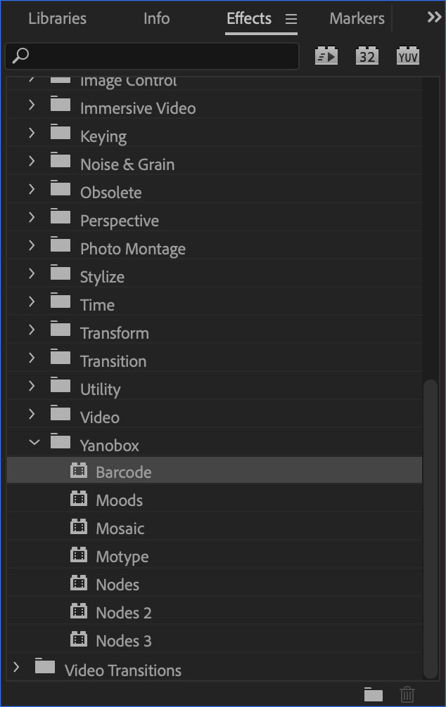 Create a new Transparent Video asset in your project, and drag it to your timeline. Look for the Barcode generator in the Yanobox category. Drag the plugin over the Transparent Video clip and use the parameter inspector to begin setting it up.