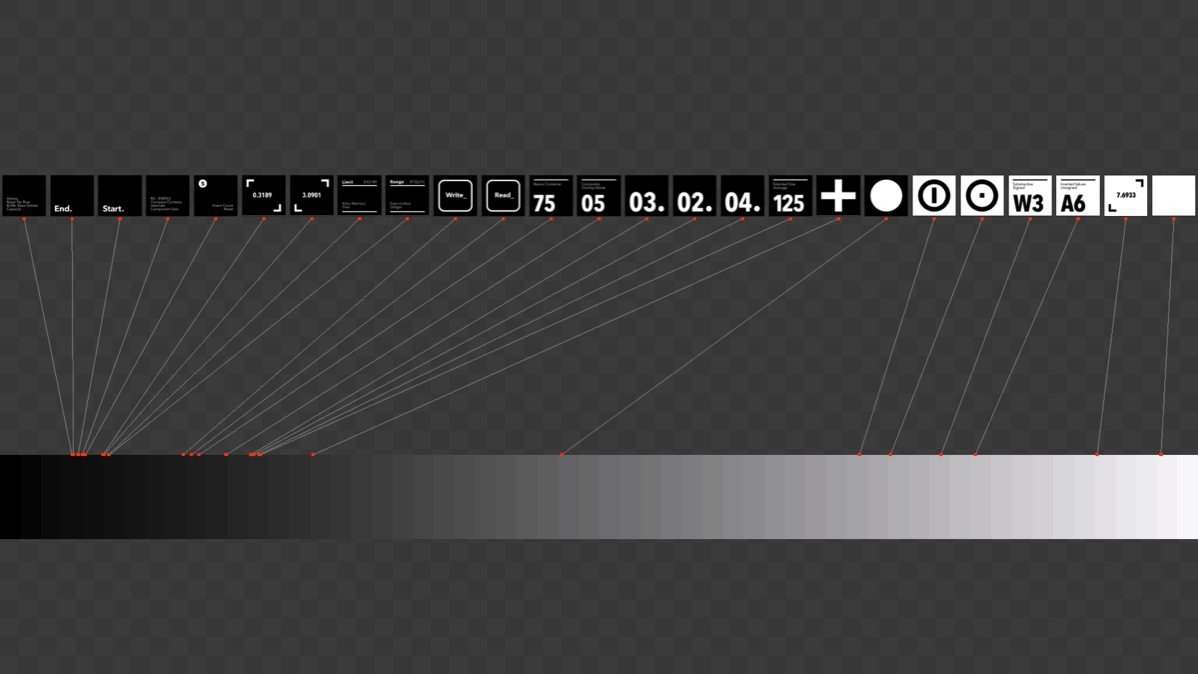 A texture atlas or motif is an image or a video loop containing footage aligned on a grid. Each cell can be a different image, graphic element, text or video loop. Mosaic optionally sorts the texture atlas cells by luminance to closely manipulate the appearance of the original footage. Mosaic allows for a texture atlas to have a grid with a maximum size of 16 columns and 16 rows, or 256 cells.